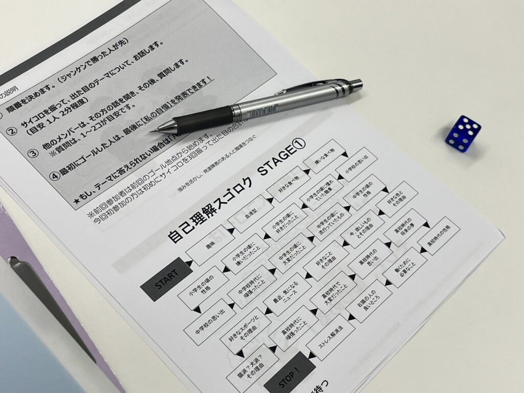 今回取り組んだのは、ゲーム形式で楽しみながら自己理解を深める「自己理解すごろく」です。ルールはシンプル。サイコロを振って、止まったマスのテーマについて、順番にお話していきます。