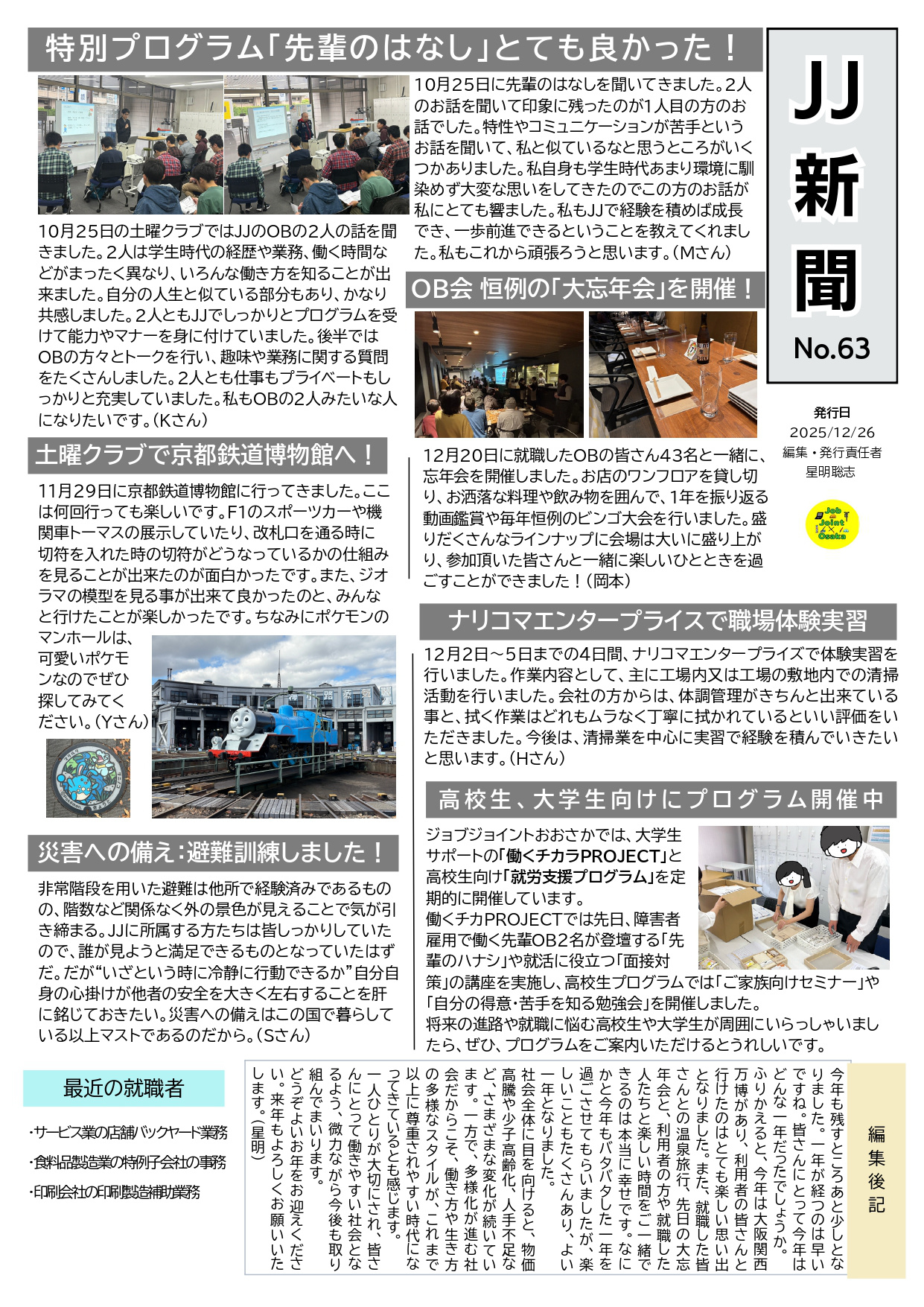 JJ新聞 2ヶ月に1回程度、「JJ新聞」と題したご利用者・ご家族向けの新聞を発行しています。プログラム・企業実習の様子やおすすめの情報等について、情報提供をさせていただいています。 最近のJJ新聞 ▶︎JJ新聞No.63(2025年12月26日発行) ▶︎JJ新聞No.62(2025年10月14日発行) ▶︎JJ新聞No.61(2025年3月31日発行) ▶︎JJ新聞No.60(2024年12月26日発行) ▶︎JJ新聞No.59(2024年5月23日発行) ▶︎JJ新聞No.58(2023年8月21日発行) ▶︎JJ新聞No.57(2023年4月20日発行) ▶︎JJ新聞No.56(2022年12月27日発行) ▶︎JJ新聞No.55(2022年6月7日発行) ▶︎JJ新聞No.54(2022年3月31日発行) ▶︎JJ新聞No.53(2021年12月28日発行) ▶︎JJ新聞No.52(2021年9月14日発行) ▶︎JJ新聞No.51(2021年6月2日発行) ▶︎JJ新聞No.50(2021年3月8日発行) ▶︎JJ新聞No.49(2020年12月10日発行) ▶︎JJ新聞No.48(2020年9月15日発行) ▶︎JJ新聞No.47(2020年7月3日発行) ▶︎JJ新聞No.46(2020年3月31日発行) ▶︎JJ新聞No.45(2020年1月30日発行) ▶︎JJ新聞No.44(2019年9月30日発行) ▶︎JJ新聞No.43(2019年7月30日発行) ▶︎JJ新聞No.42(2019年4月18日発行) ▶︎JJ新聞No.41(2019年2月19日発行) ▶︎JJ新聞No.40(2018年12月25日発行) 電話でのお問い合わせ TEL:072-668-1123受付時間:8:45〜17:30(平日)
